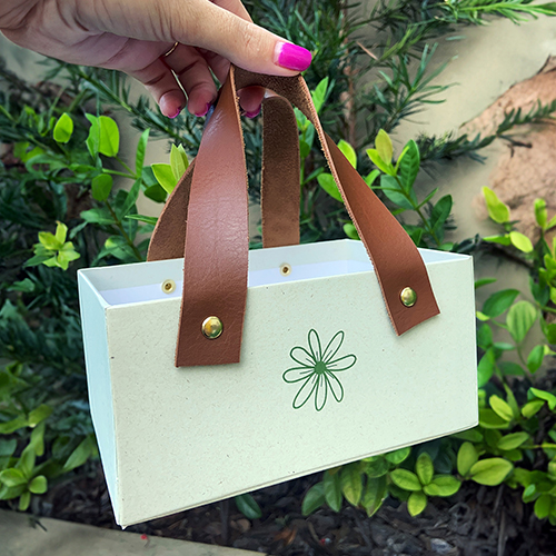 Possui Alça de Couro Ecológico e Ilhós Dourado.